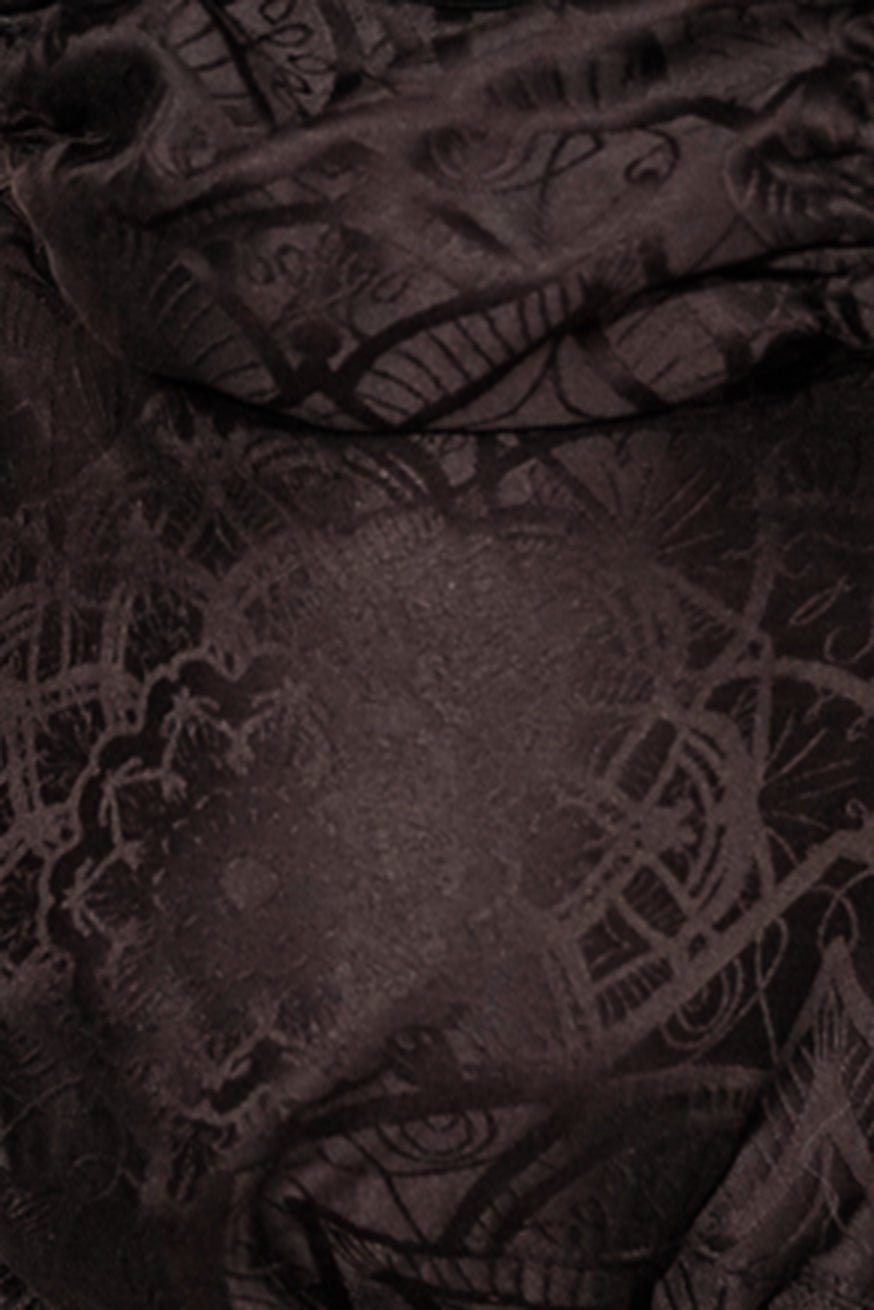 Der Stoff wirkt wie fließendes Ebenholz. Elegant, intensiv, und durchzogen von einem Muster, das an alte Gravuren erinnert – verspielt und dennoch kraftvoll. Es ist ein Design, das Geschichten erzählt, ohne Worte zu brauchen.