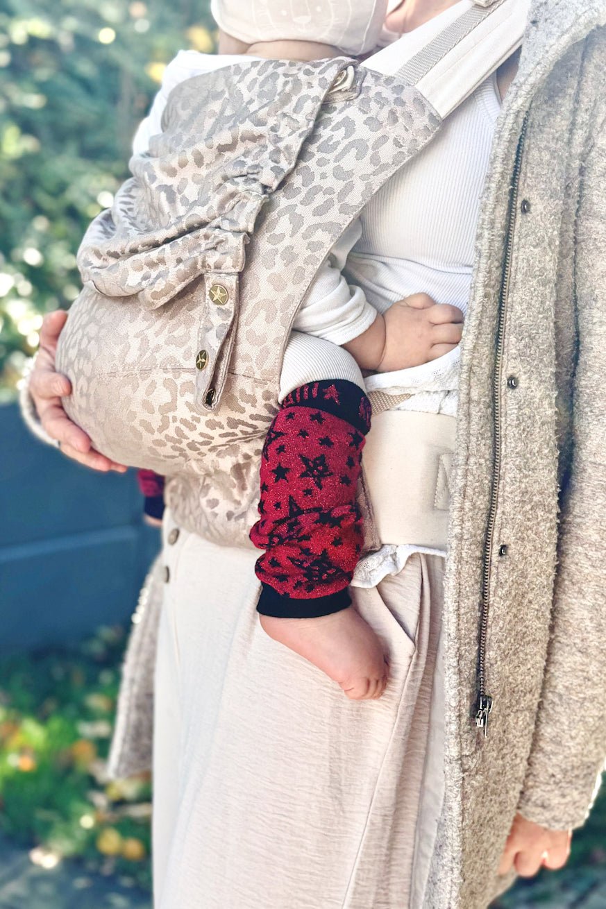 Com o nosso original KOKADI As algemas de transporte protegem a parte de trás dos joelhos do bebê contra fricção ao carregá-las, aquecem as pernas de maneira confiável e protegem a pele do vento e da luz solar.