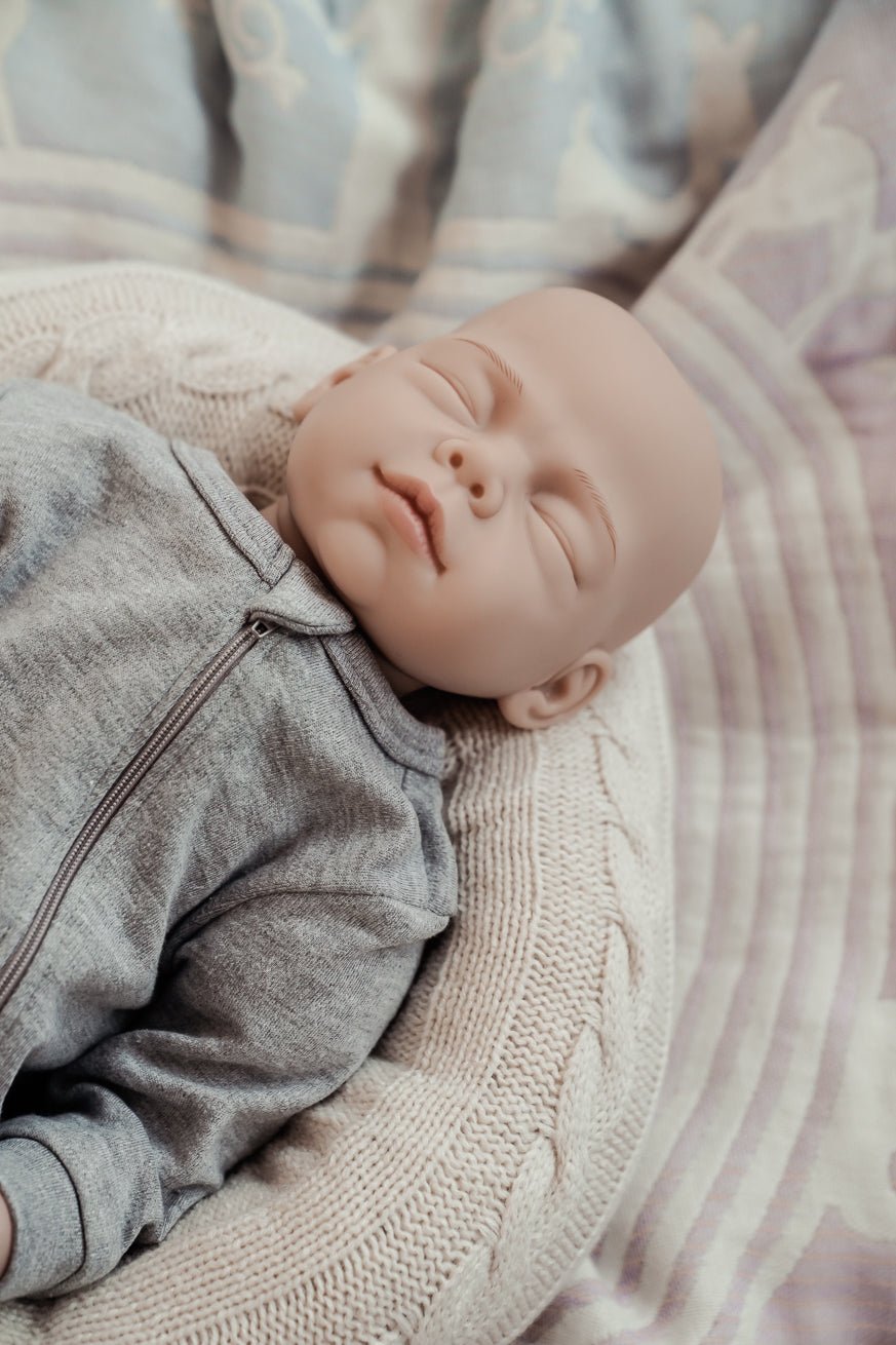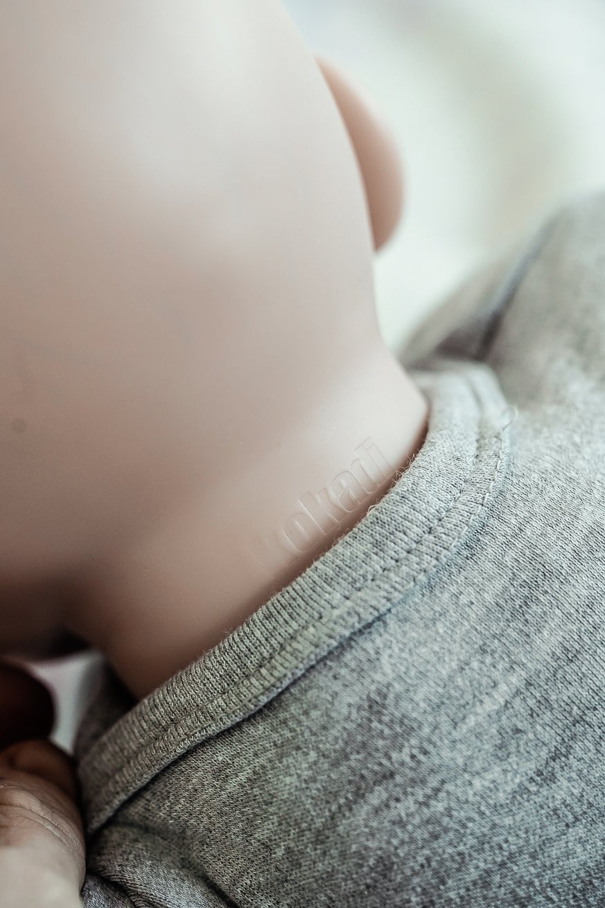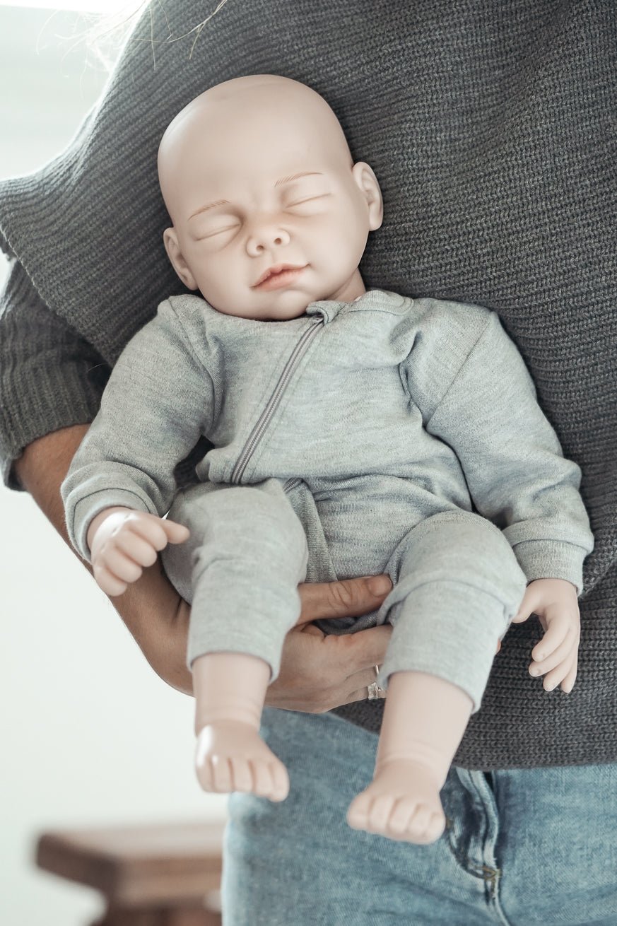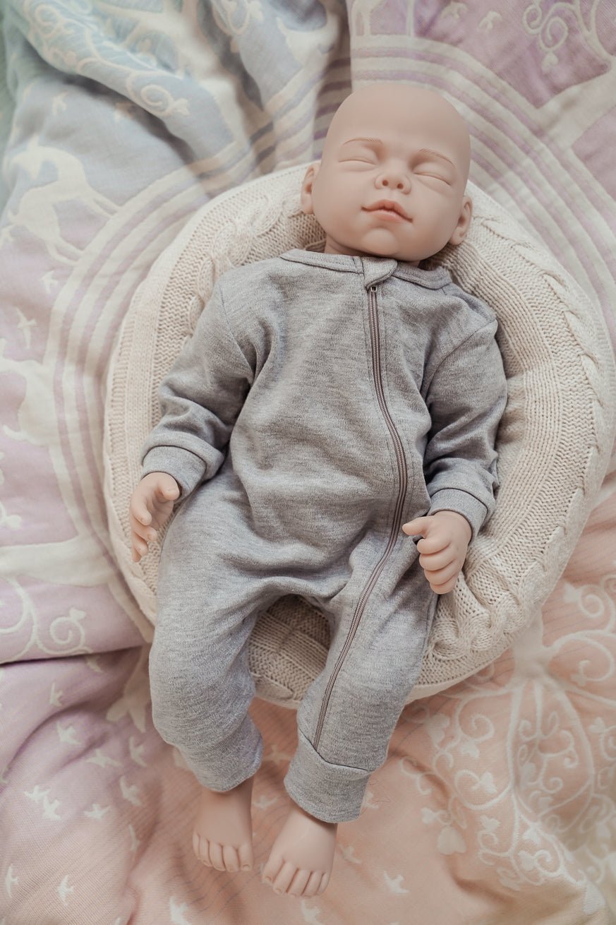Nossa boneca chega a um molho confortável e rápido com um macacão cinza feito de 100% algodão com um zíper.